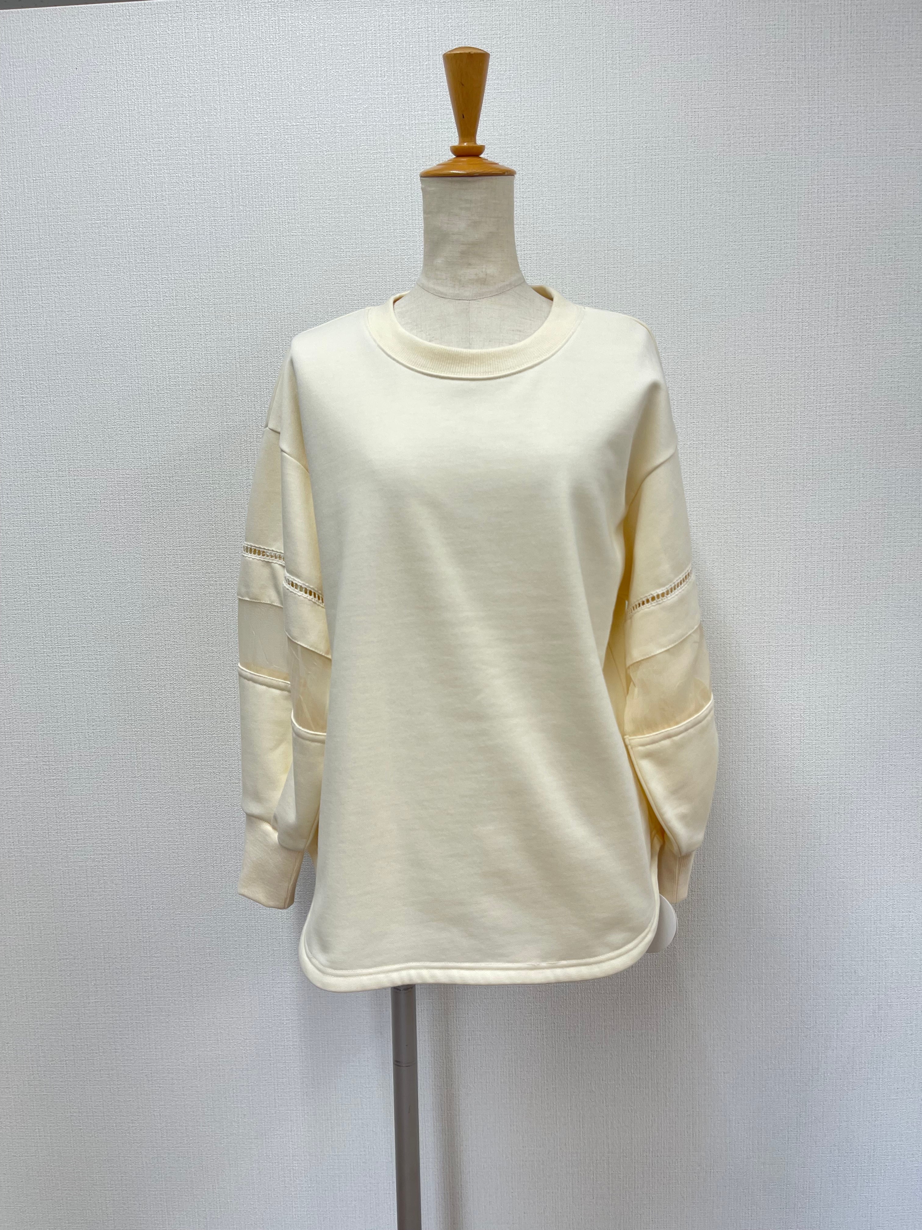 スウェット裏毛をベースに程よい透け感が魅力のオーガンジーをハシゴレースで挟み込んだこだわりのデザイン。裾はラウンド切り替えで大人カジュアルな雰囲気のアイテム。これ1枚でこなれた大人カジュアルスタイルが完成するデイリーアイテム。