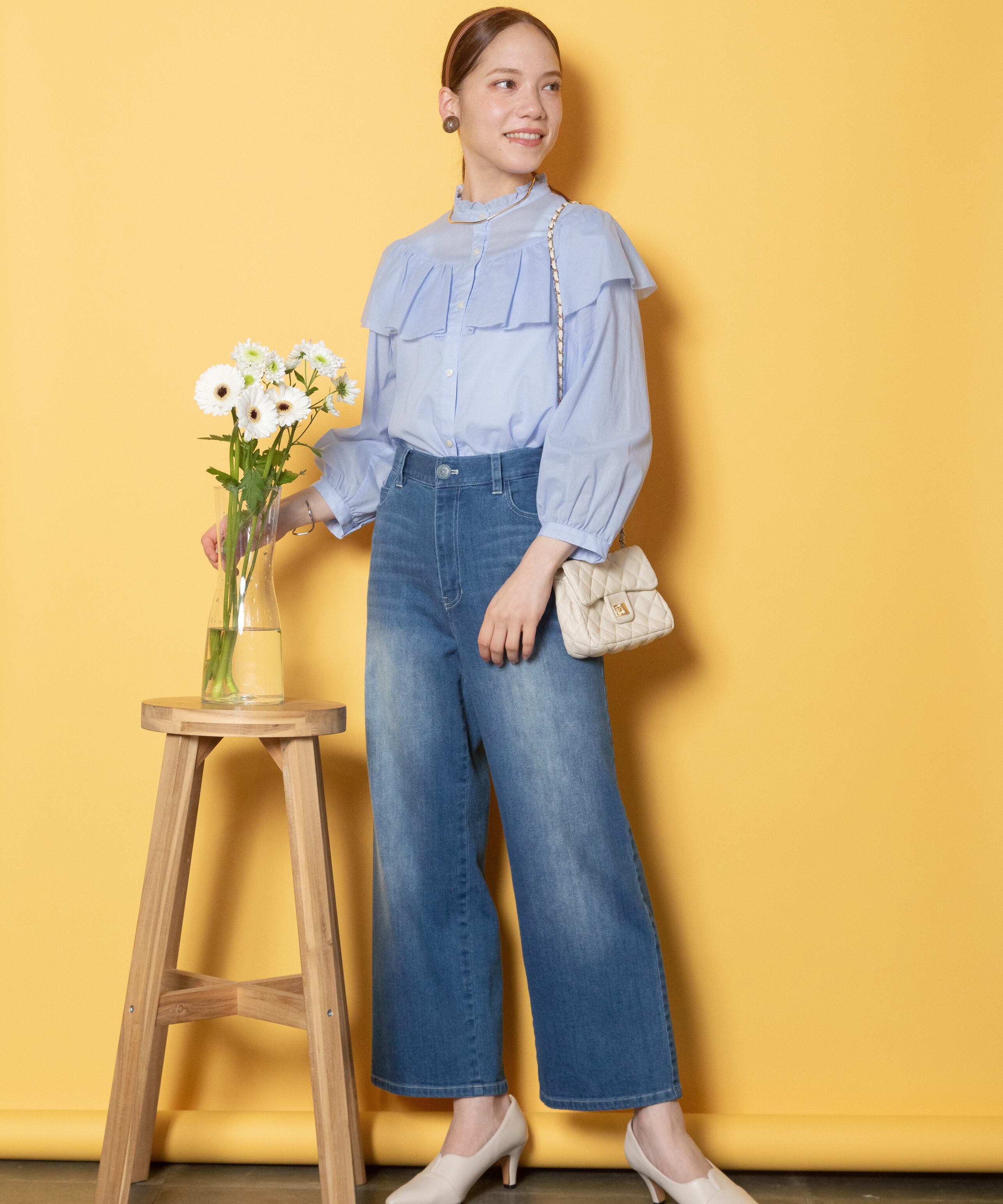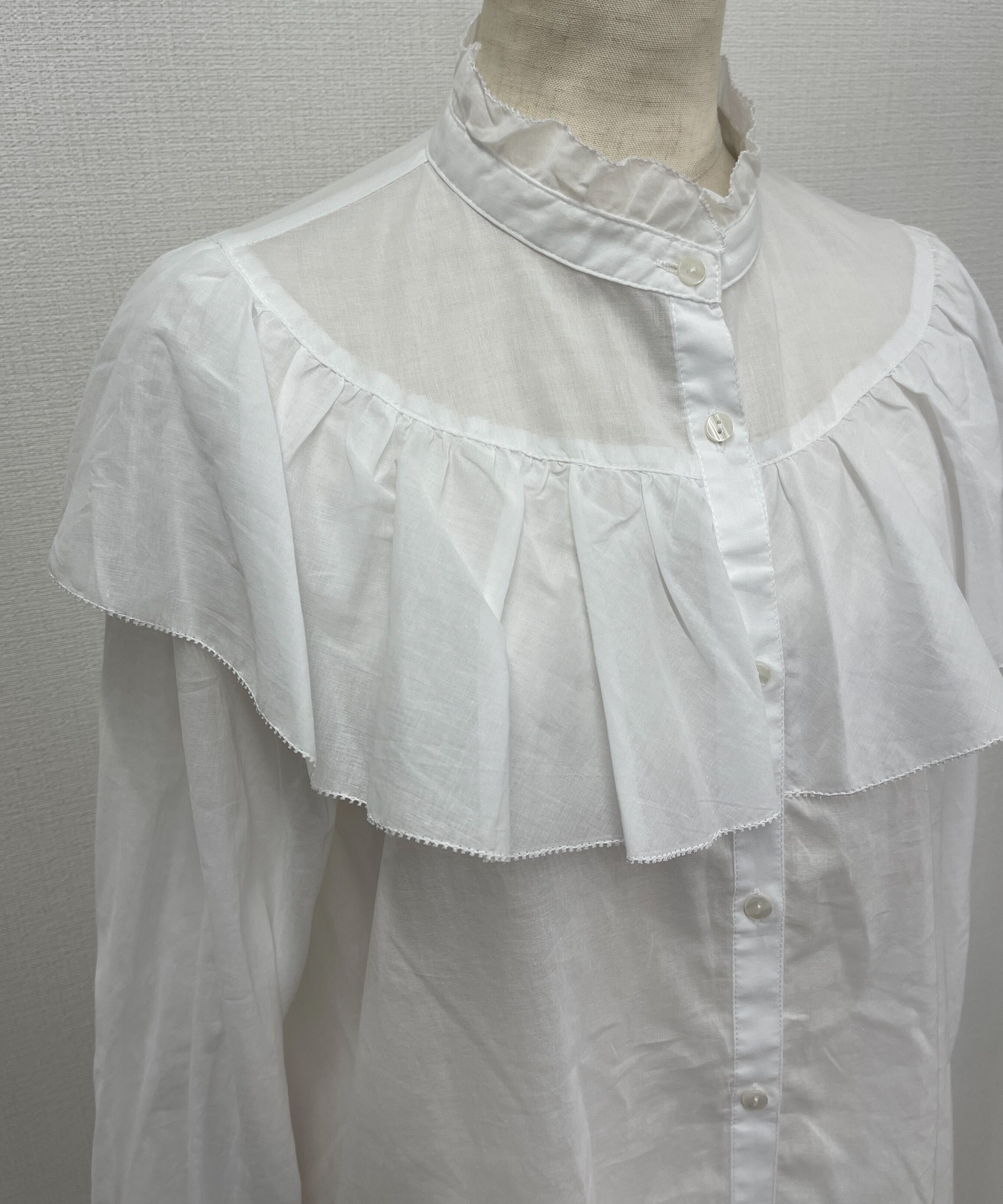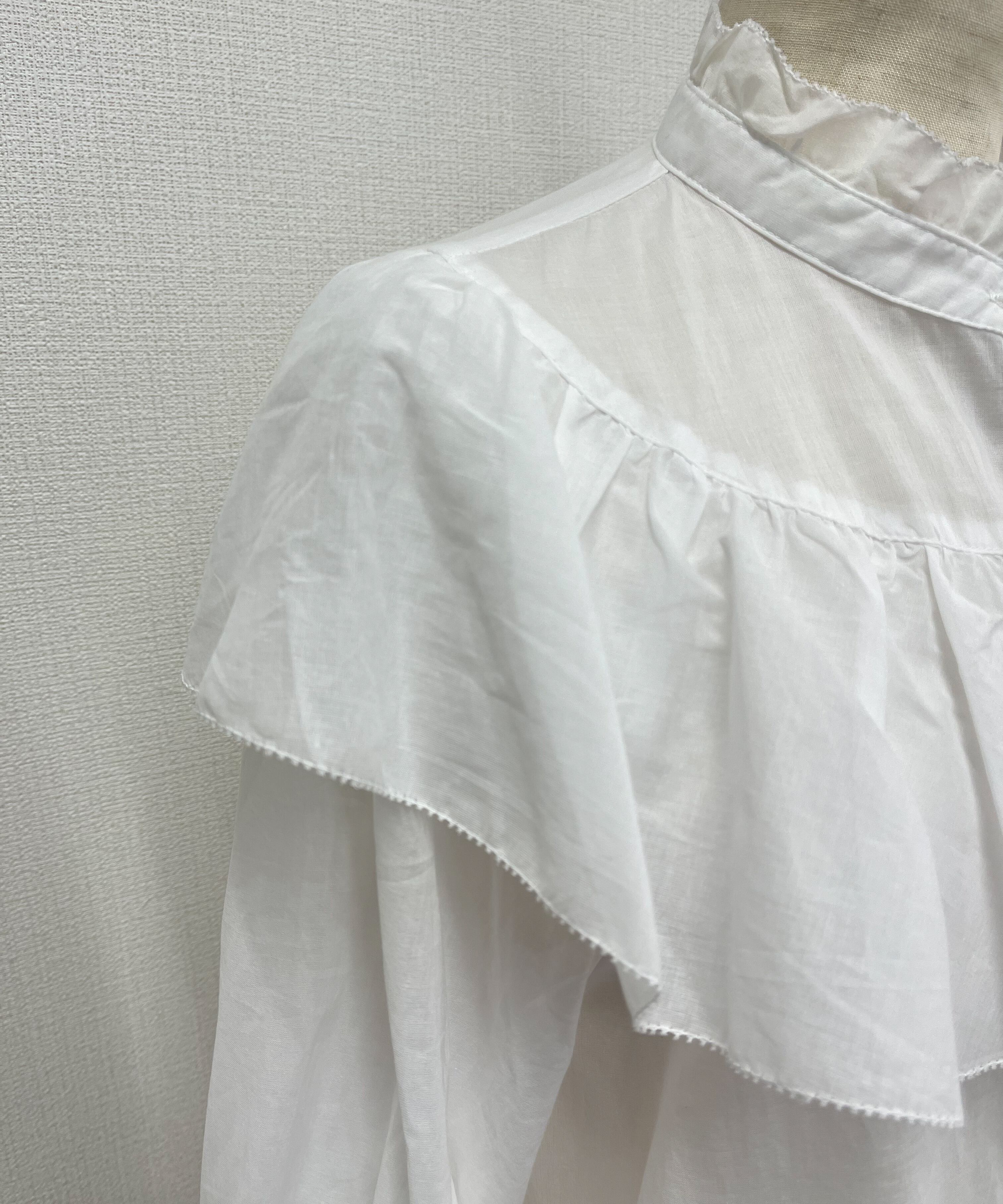 大人フェミニン派に大人気のガーリなフリルブラウス。プチスタンド襟、たっぷりフリルのケープ風デザイン。襟ぐりとフリル端はピコヘムに加工。
