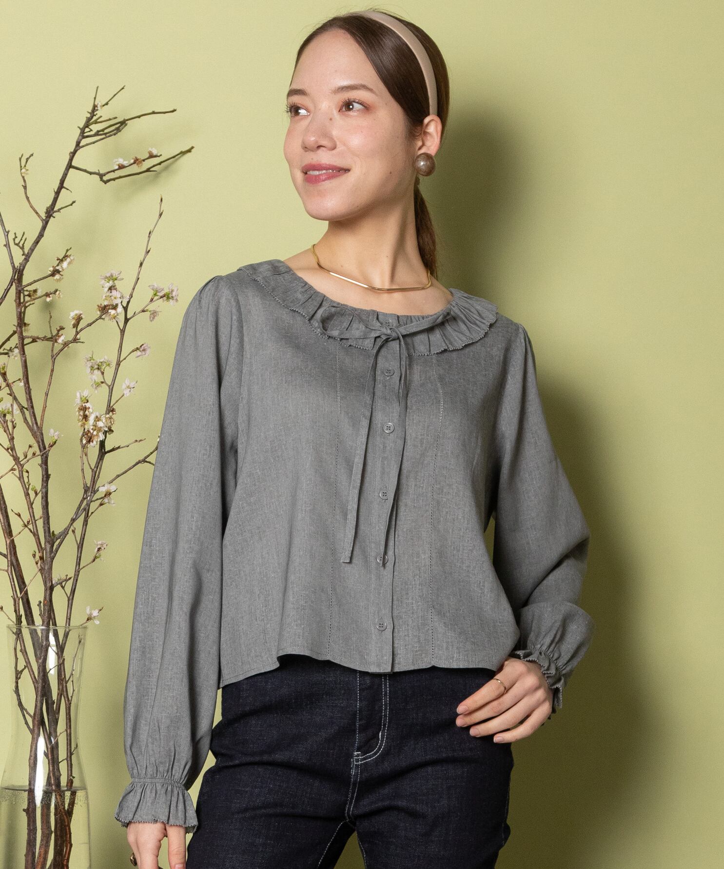 大人フェミニン派に大人気のガーリなフリルリボンブラウス。トレンドの着丈は短めのショート丈。前縦とフリル端はピコヘムに加工。